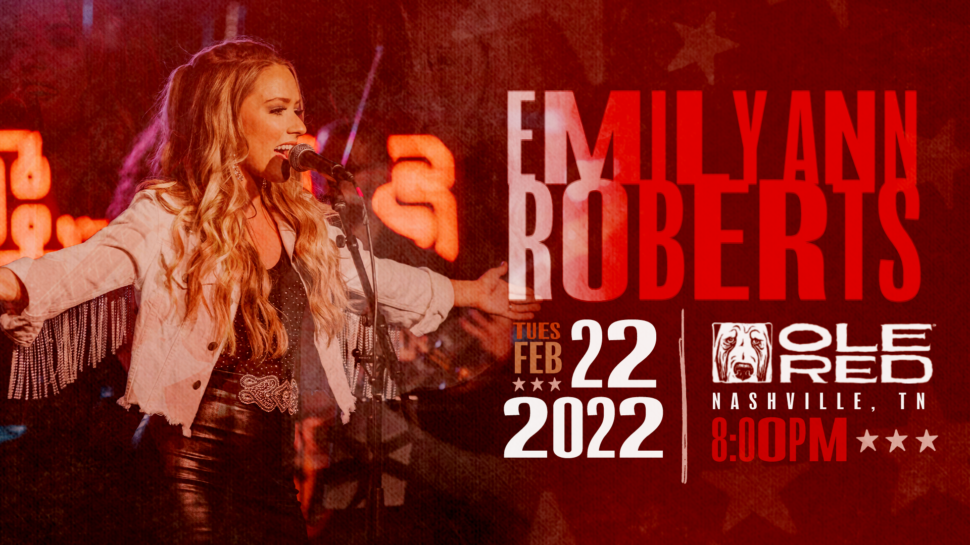 Stomp your boots and join Emily Ann Roberts as she hits the Ole Red Nashville stage for a night of live country music!