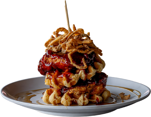 Hand-breaded Southern Fried Chicken Breasts, Nashville Honey (Hot Or Not), Belgian Waffles, Onion Straws, Maple Syrup
