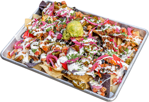 Seasoned Taco Meat, Tortilla Chips, White Queso, Roasted Corn Pico De Gallo, Pickled Red Onions, Pickled Jalapeños, Smashed Avocado, Sour Cream